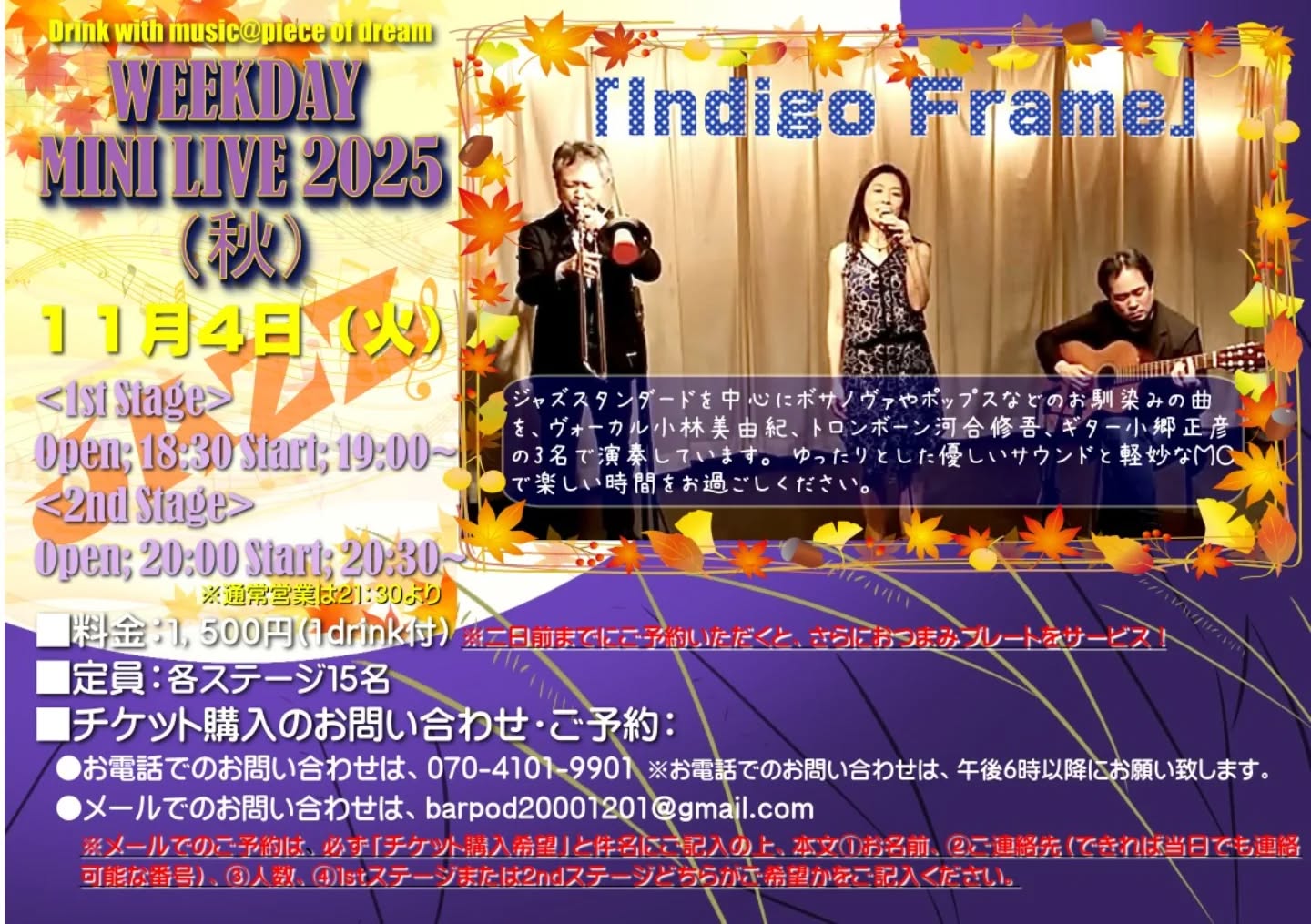 ■ 11/4(火) 19:00/20:30(入れ替え制) Indigo Frame @PeaceOfDream